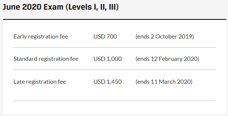 CFA的考试报名费用跟报名时间相关,报名越早越便宜。而且不同年份还可能不一样,选实体教材还要额外加钱。